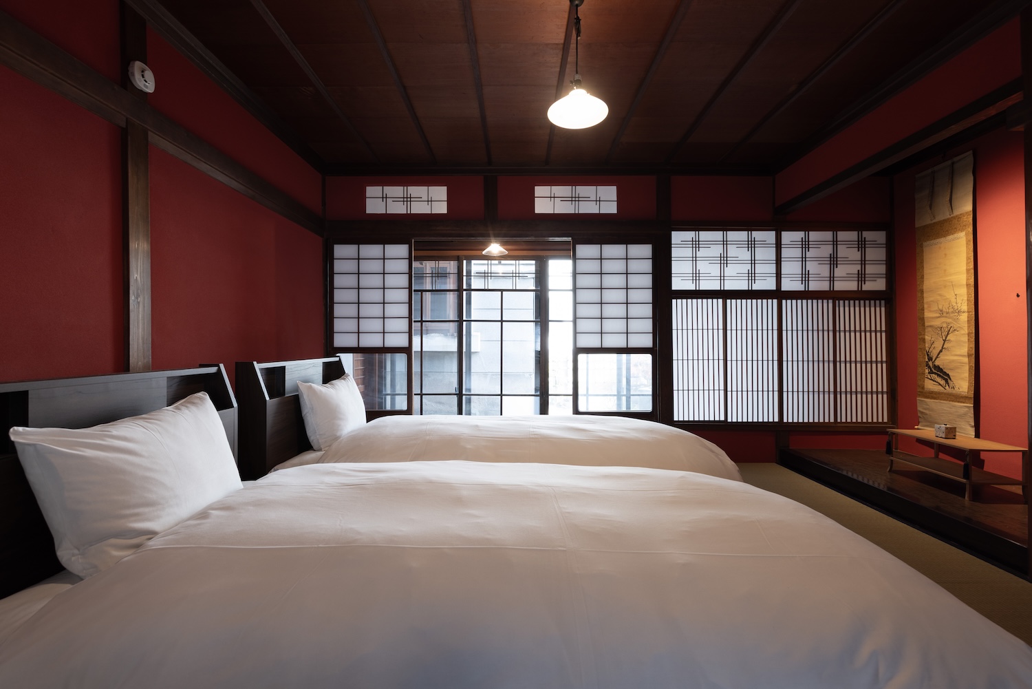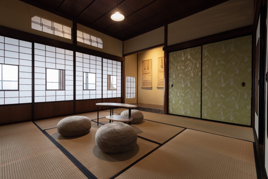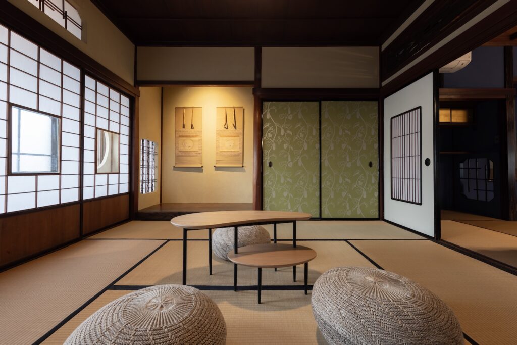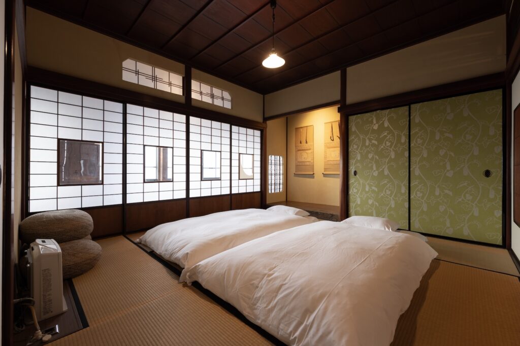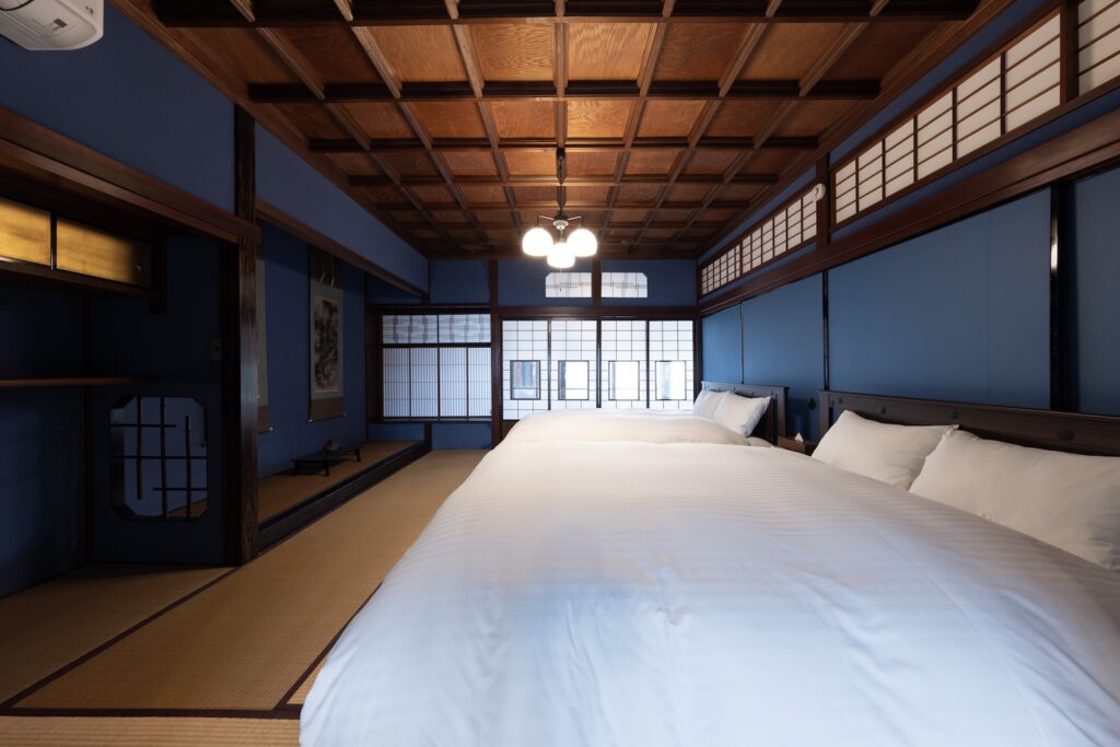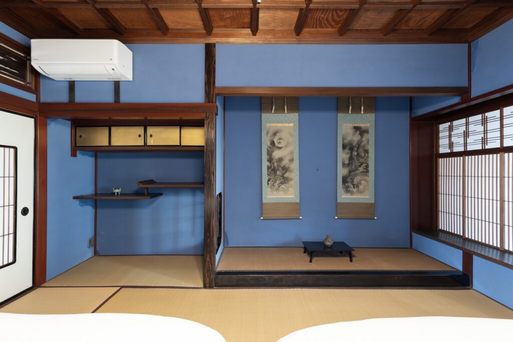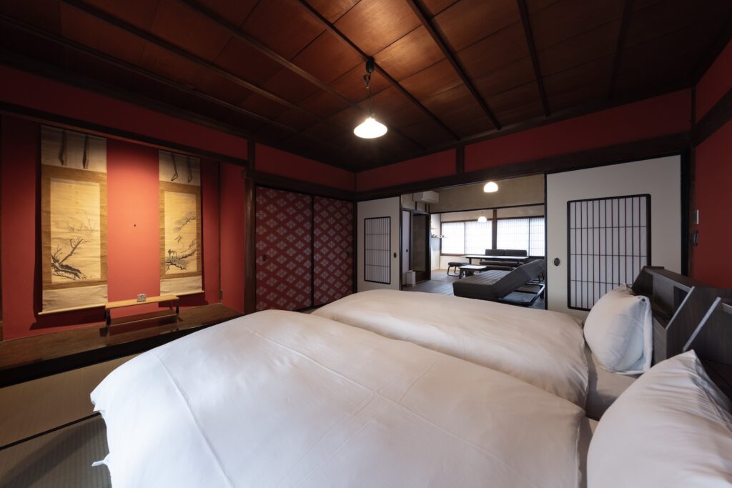 3つの寝室には、それぞれ、群青、朱、鴬の塗り壁があり、床の間には、掛け軸、香炉などのしつらえがあります。また、唐紙には、金沢からかみを使用し、金沢らしさがより味わえます。