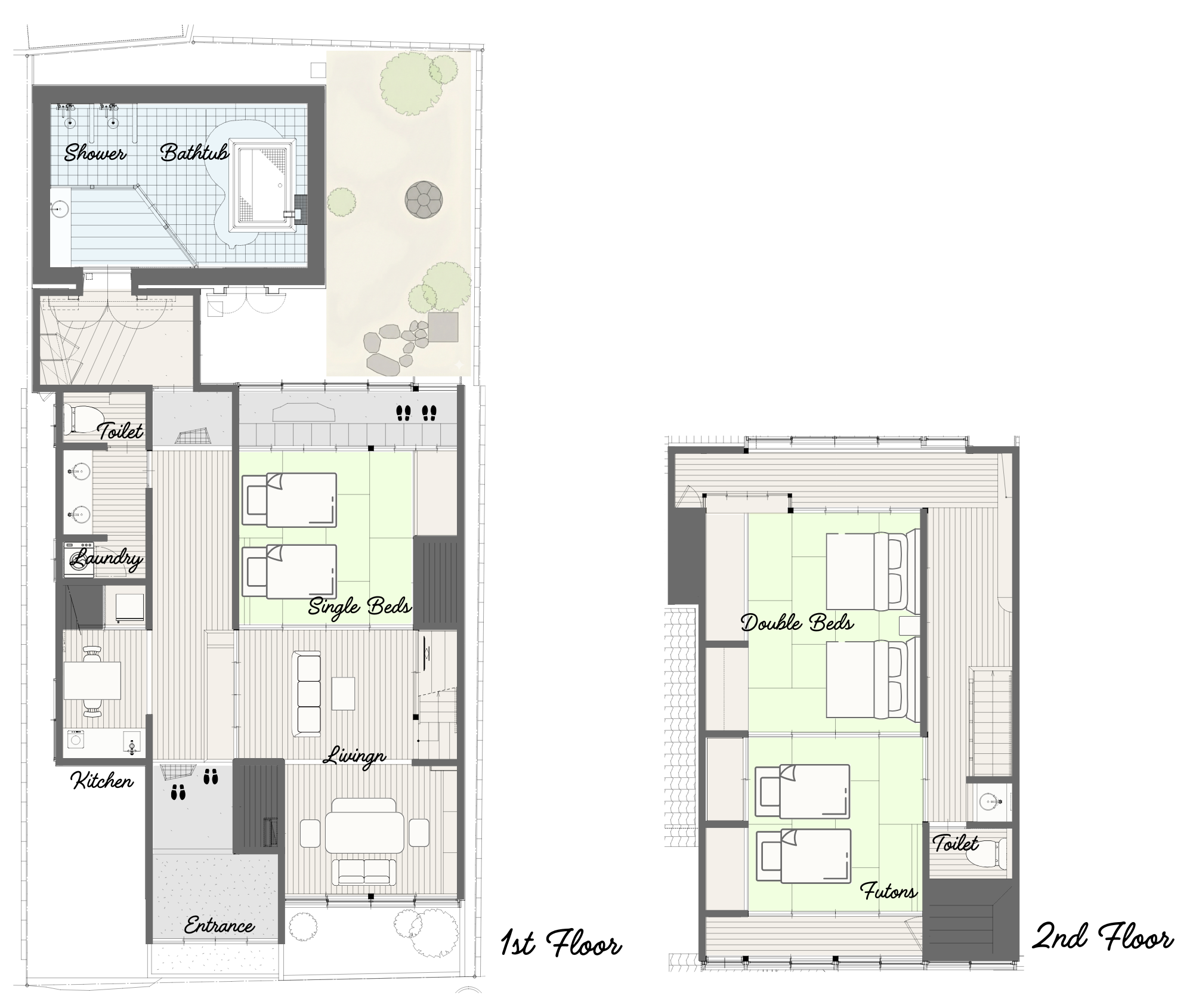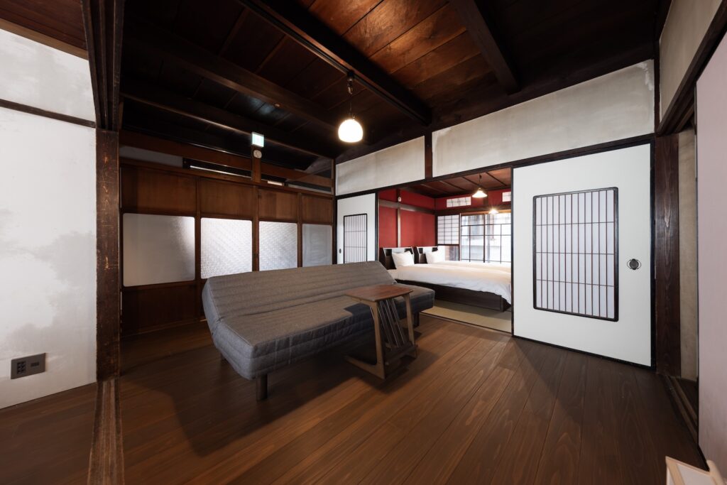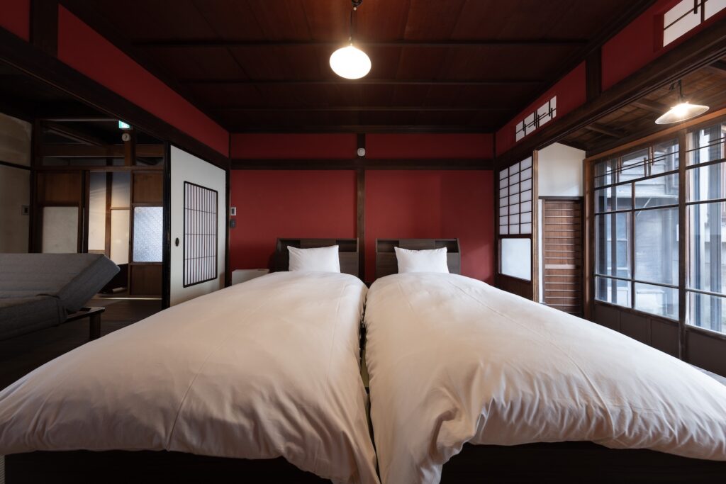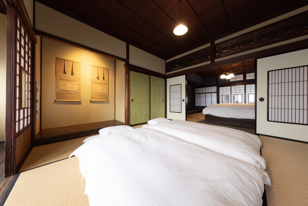 1階に1室、2階に2室の寝室がございます。それぞれの寝室は、和モダンな雰囲気の寝室や、伝統的な和室をご用意しました。どの部屋も、心からリラックスできる落ち着いた空間です。