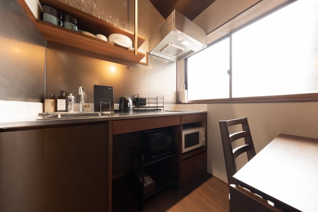 リビングは、8人で座っても余裕があるほどの広さがあります。観光をたっぷり楽しんだ後は、このリビングに集まって金沢の夜を満喫しませんか?近江町市場で買ってきた旬の食材を料理して、みんなで食卓を囲むのも素敵な思い出になりますよ。