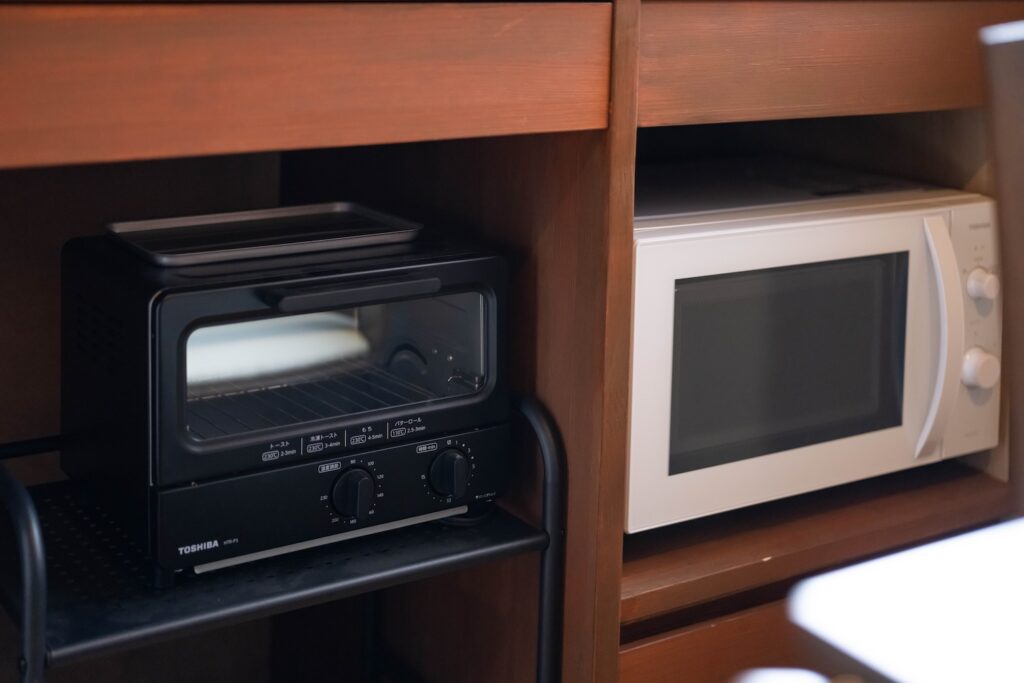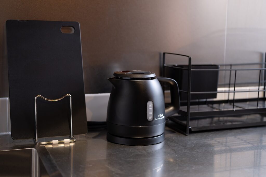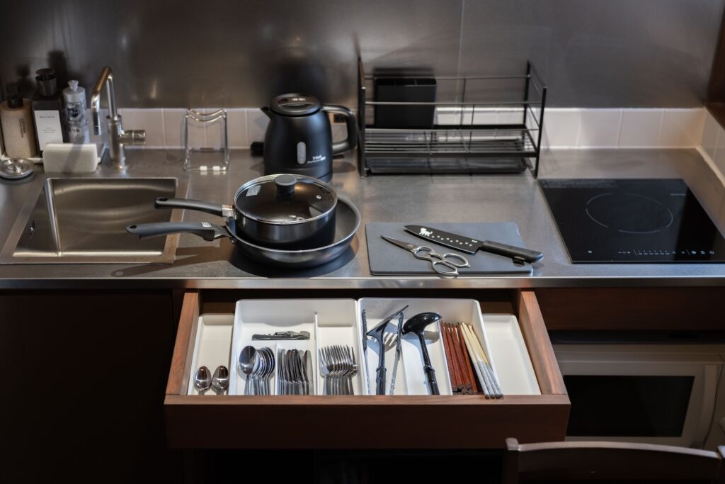 冷蔵庫・IH1口・電子レンジ・鍋・フライパン・電気ケトル・包丁・まな板・料理はさみ・缶切り・栓抜き・菜箸・フライ返し・おたま・マグカップ・グラス・お皿・カトラリー・食器用洗剤・スポンジ・ふきん