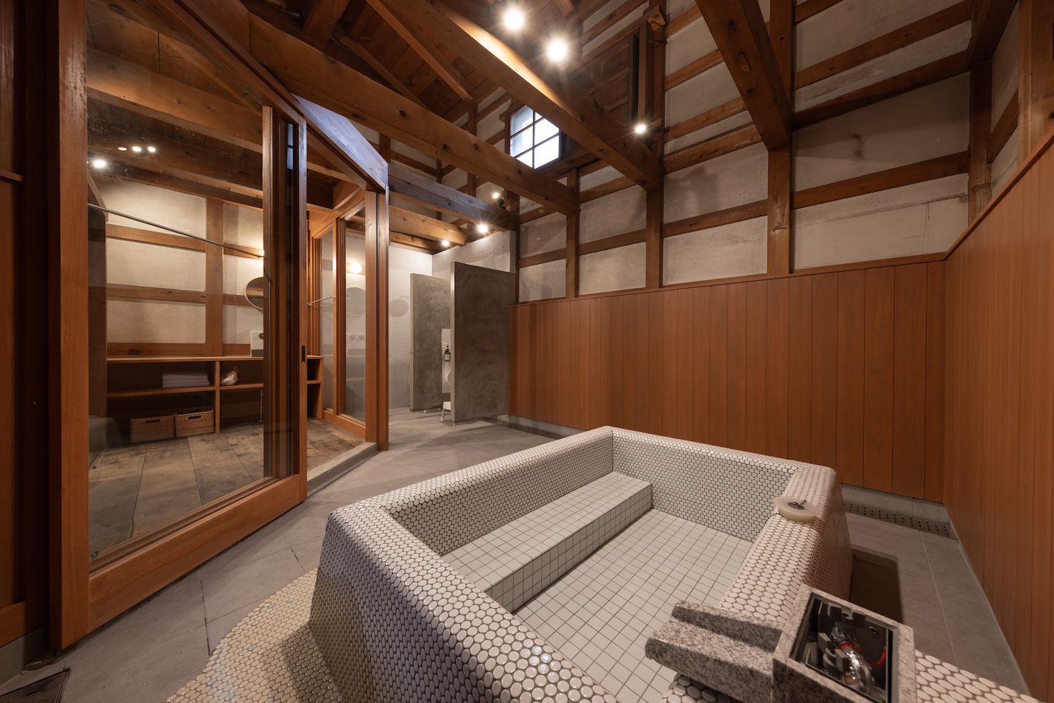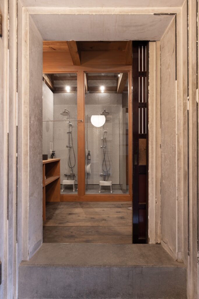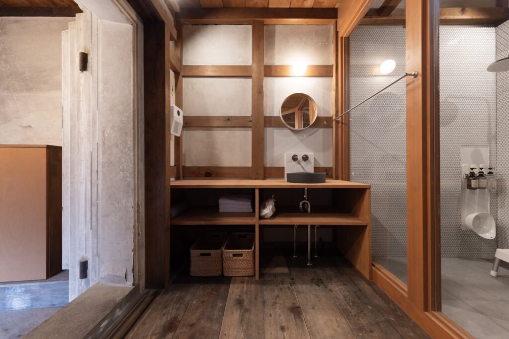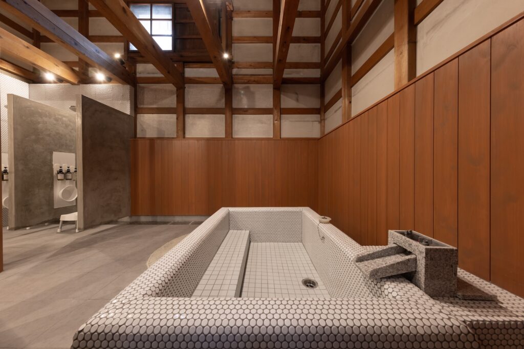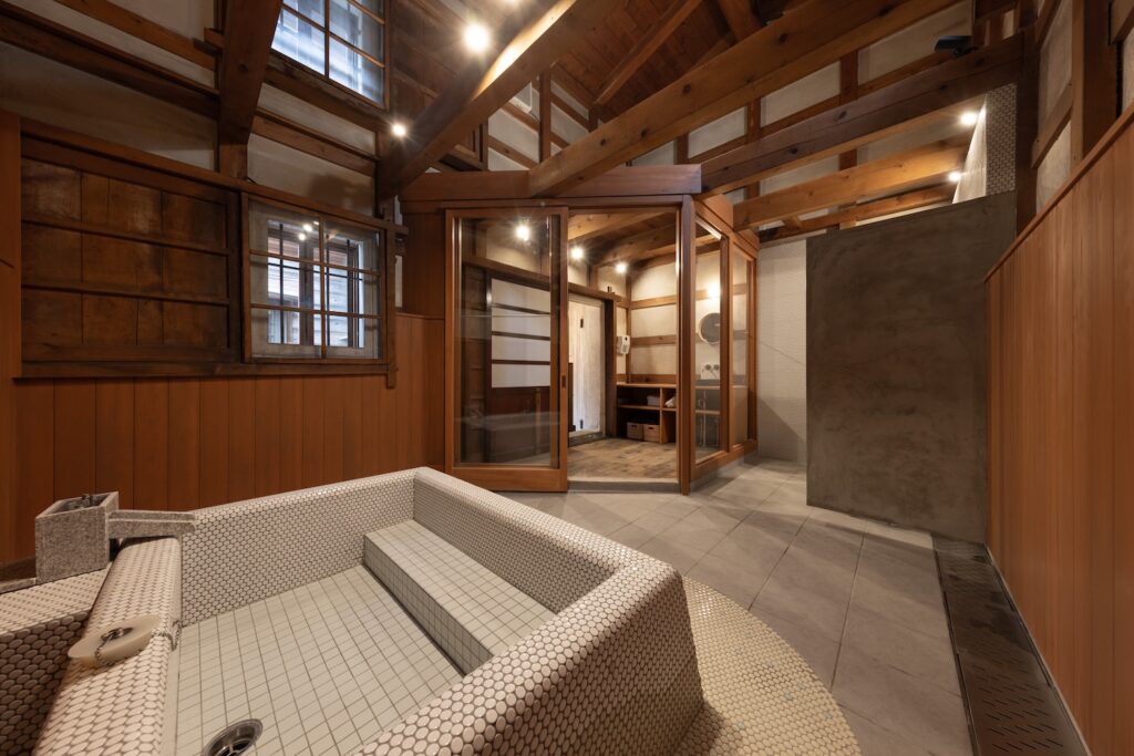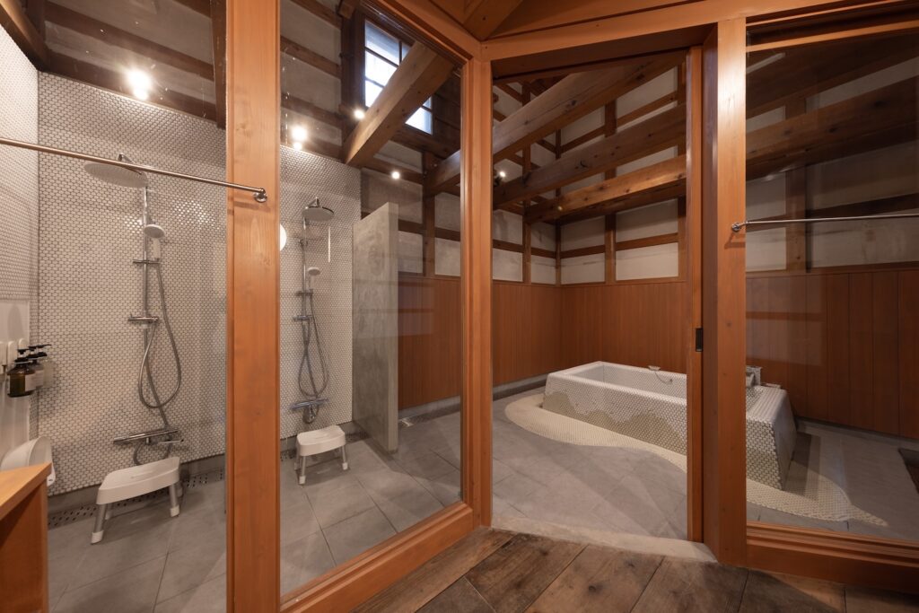 蔵をリノベーションした趣のある広々とした浴室をご用意いたしました。 ご家族皆様でゆったりと団欒のひとときをお過ごしいただけるほどの、十分な大きさを備えております。